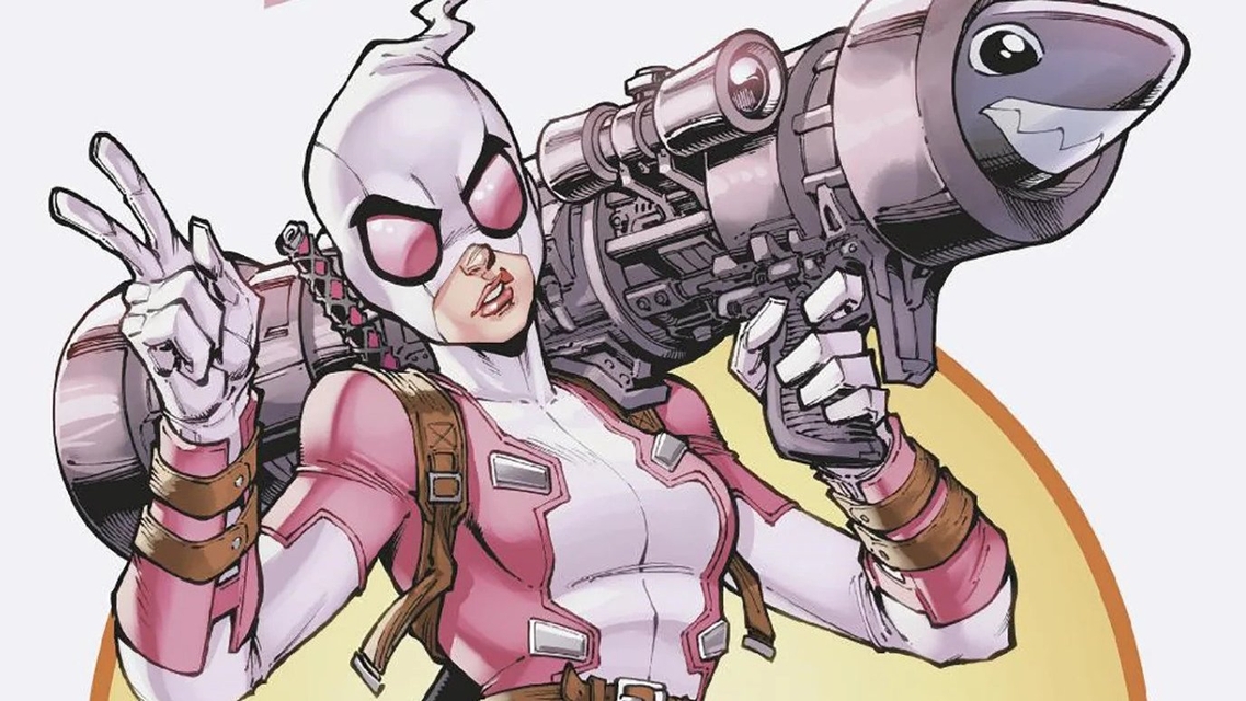 Gwenpool (Wendolyn Gwen Poole) suddenly finds herself caught in a fracture in space-time. While relaxing at a cafe, she experiences a surreal dimensional split: the environment freezes and fragments, and tiny Deadpool-like creatures materialize—one missing a hand, and one a head—causing chaos until Wade blasts them away. Gwen flees.