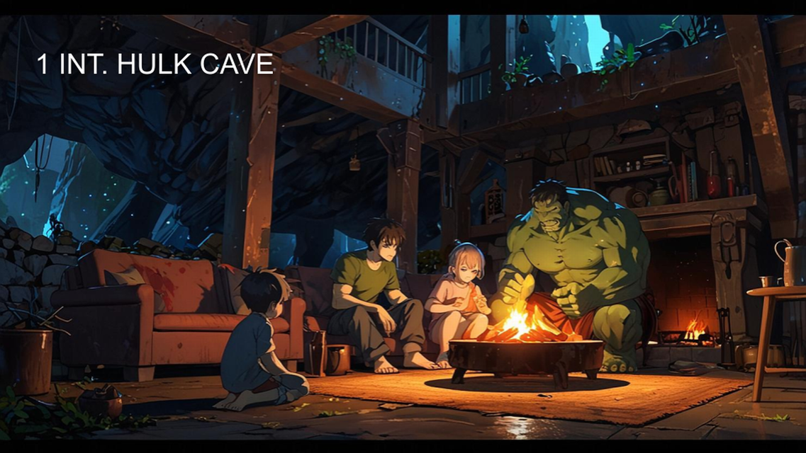 Hulk children explore the mountains where Banner’s ship crashed long ago. Snow containing gamma radiation strengthens them and protects them from Symbiote bats. They seek relics, flowers, and the origins of their people—teasing future revelations about Banner’s arrival and the ancient war.